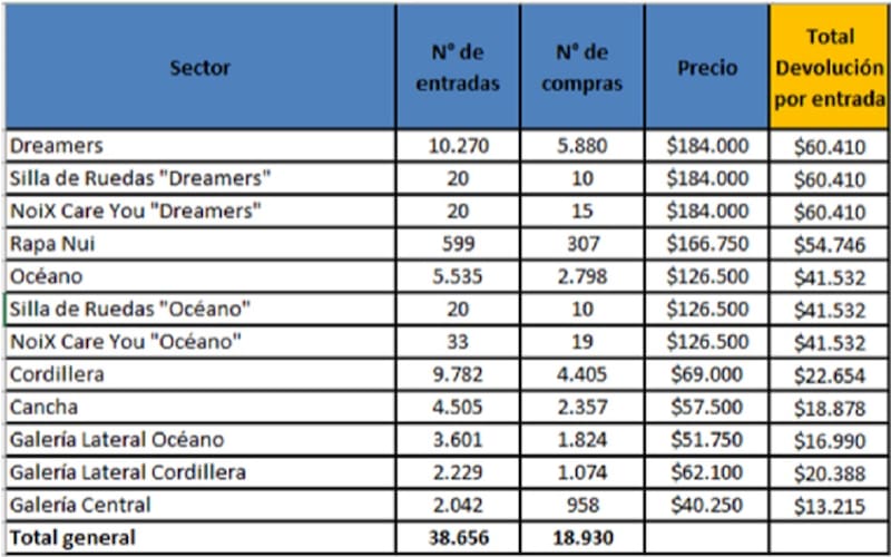 Cada consumidor recibirá una devolución correspondiente al tipo de entrada adquirida. Es decir, una persona que compró en el sector Dreams, pagando un valor total de $184.000, recibirá una devolución de $60.410.