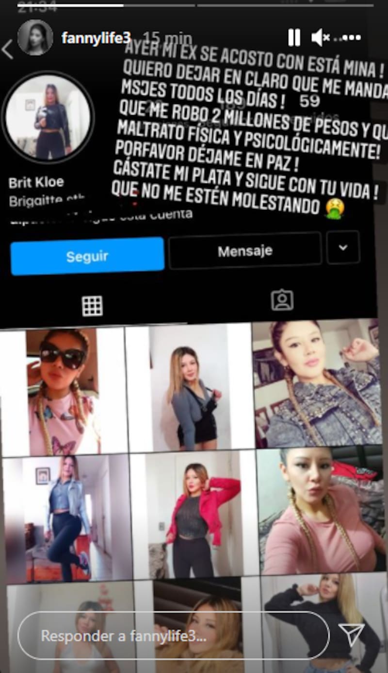 "Ayer mi ex se acostó con esta mina. Quiero dejar en claro que me manda mjes todos los días!", escribió la exchica reality en una de sus historias de Instagram, alertando a sus seguidores.