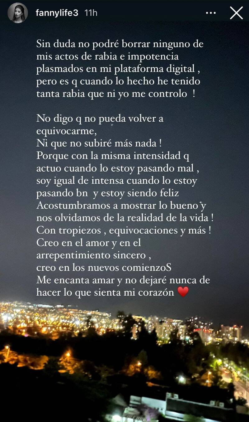 Y en esa misma onda, agregó: "no digo que no pueda volver a equivocarme, ni que no subiré más nada. Porque con la misma intensidad que actúo lo estoy pasando mal, soy igual de intensa cuando lo estoy pasando bien y estoy siendo feliz. Acostumbramos a mostrar lo bueno y nos olvidamos de la realidad de la vida. Con tropiezos, equivocaciones y más. Creo en el amor y en el arrepentimiento sincero, creo en los nuevos comienzos. Me encanta amar y no dejaré nunca de hacer lo que sienta mi corazón".