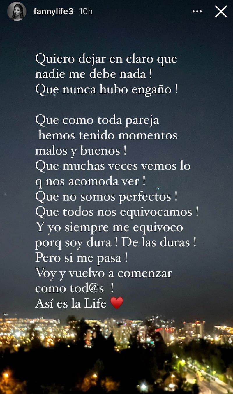 Por último, Cuevas aclaró el supuesto engaño. "Quiero dejar en claro que nadie me debe nada. Que nunca hubo engaño. Que como toda pareja hemos tenido momentos malos y buenos, que muchas veces vemos lo que nos acomoda ver, que no somos perfectos, que todos nos equivocamos. Y yo siempre me equivoco porque soy dura. De las duras. Pero si me pasa, voy y vuelvo a comenzar como todp@s. Así es la Life", cerró.