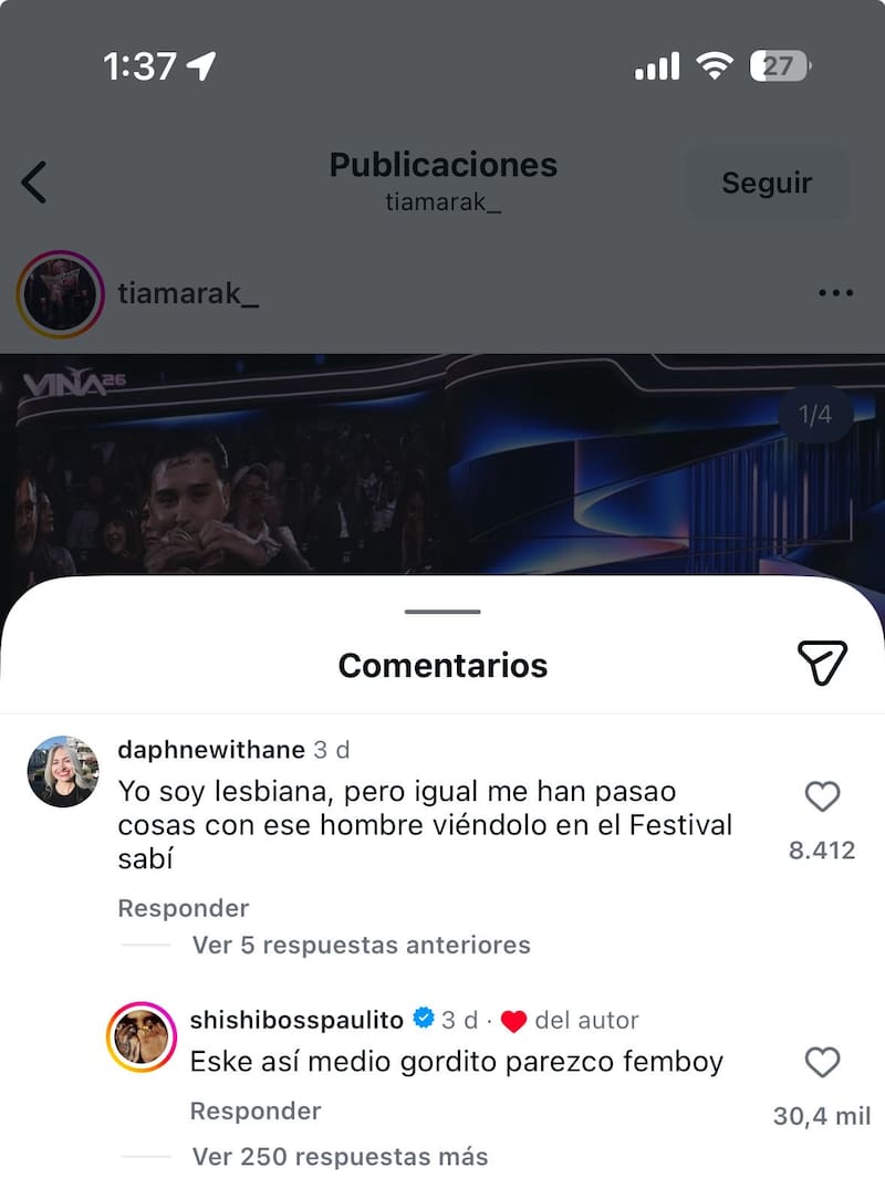 Todo comenzó cuando en un video del artista subido por @tiamarak en Instagram, una usuaria publicó en la publicación: “Yo soy lesbiana, pero igual me han pasado cosas con ese hombre viéndolo en el Festival”.