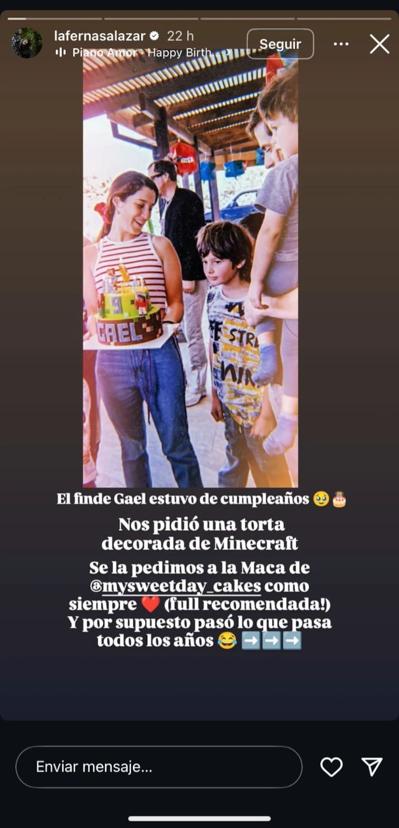 La intérprete mostró algunos divertidos detalles del festejo: “El finde Gael estuvo de cumpleaños. Nos pidió una torta decorada de Minecraft”, escribió en una de las historias que subió.