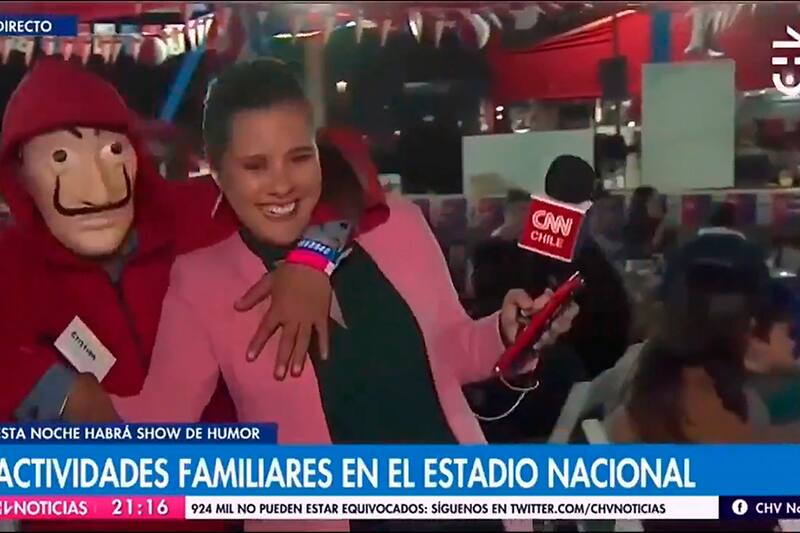Así lo mostraban en la tele, escenas donde personas disfrutaban cerca del mar, otras en algunas fondas y todo a cargo de los periodistas que no dejaron su vocación de lado para transmitir lo que pasaba en estos días feriados. Eso sí, no todo fue alegría para estos profesionales y Marianela Estrada, periodista de CHV, lo sabe muy bien ya que sufrió acoso en uno de sus despachos. Transmitiendo desde el Estadio Nacional, un hombre disfrazado de personaje de "La casa de papel" al ser entrevistado la agarró fuertemente simulando un secuestro y pasó a llevar sus partes íntimas. Insólito.