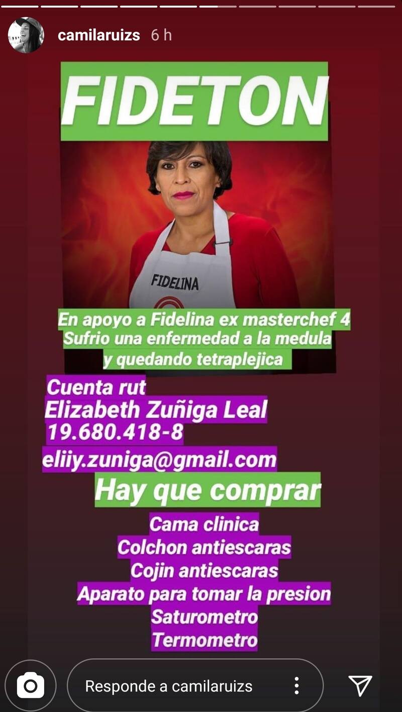 Sin embargo y a pesar de encontrarse en un tratamiento que busca recuperar el movimiento de sus extremidades, Fidelina no ha logrado recuperarse y fue Camila Ruiz, ganadora del cuarto ciclo del programa, quien a través de sus redes sociales dio cuenta de la situación actual que vive Fidelina.