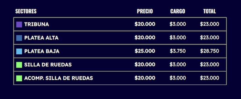 Los tickets tienen un valor que va entre los 20 y 25 mil pesos más recargo.