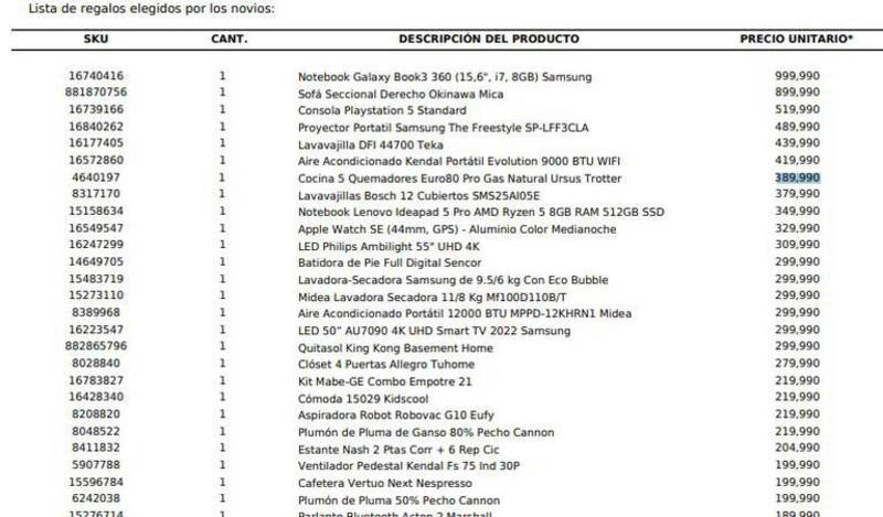 Además, según información de Publimetro, los tortolitos tienen una la larga lista de regalos publicada el 13 de noviembre, y que pueden hacerles sus invitados. Se trata de más de cien artículos disponibles a través de una conocida casa comercial, y los precios comienzan en $24.990 y llegan al millón de pesos.