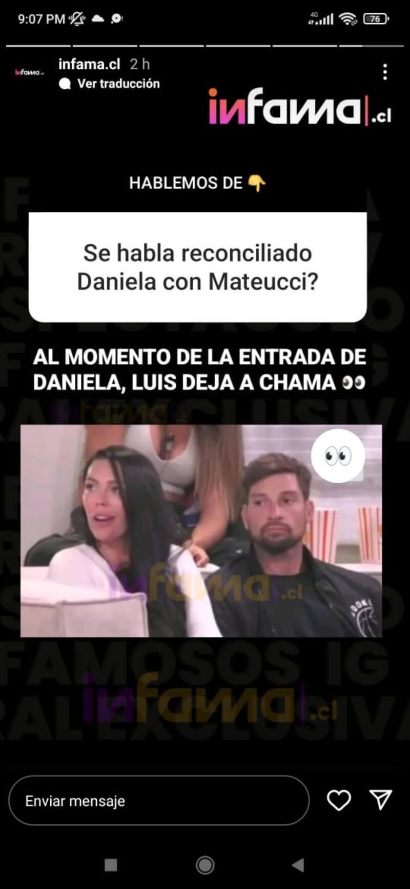 Desde el sitio de espectáculos Infama filtraron la primera imágen de Aránguiz dentro del reality, y según comentan, no tardó nada en reconciliarse con el modelo argentino, por lo que La Chama ha quedado en el olvido de Mateucci según afirmaron.