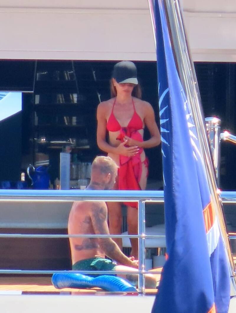 Victoria Beckham se ve absolutamente increíble en bikini rojo mientras David muestra su trabajado sixpack en un lujoso yate estacionado frente a la costa italiana.