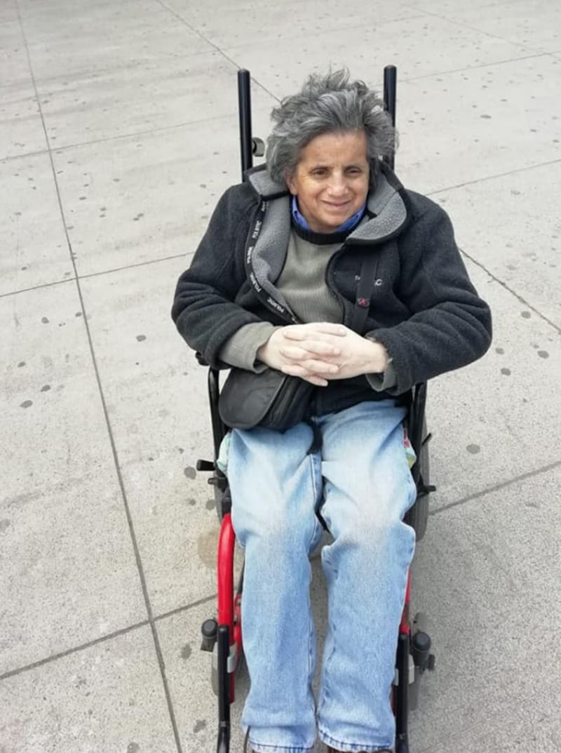 Se moviliza en una silla de ruedas a raíz de una enfermedad degenerativa que afecta los nervios del cuerpo.