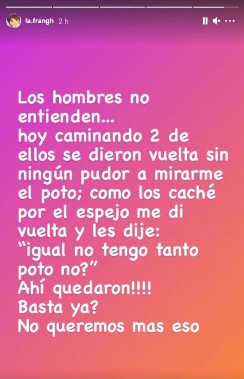 En una historia publicada en su cuenta de Instagram, la conductora del programa on line Cómplices detalló la situación. "Los hombres no entienden", señaló al comenzar su relato. "Hoy caminando, dos de ellos se dieron vuelta sin ningún pudor a mirarme el poto".