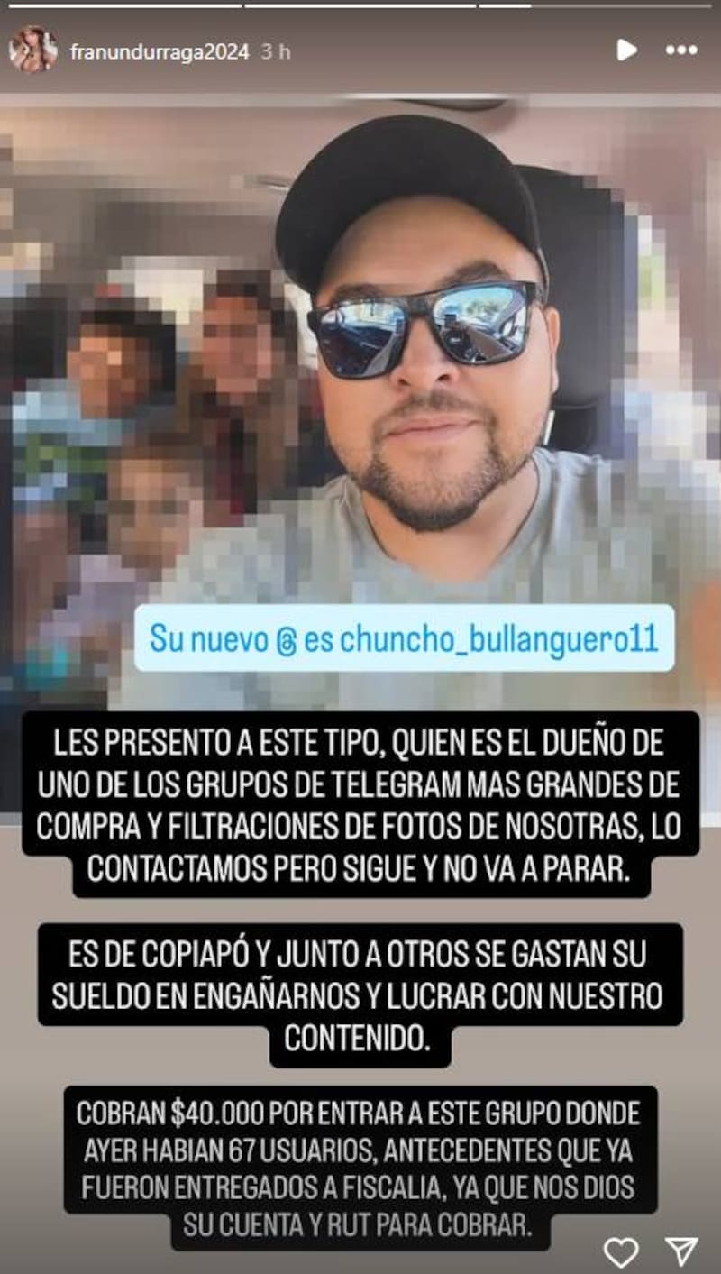 “Les presento a este tipo, quien es el dueño de uno de los grupos de Telegram más grandes de compra y filtraciones de nuestras fotos y videos”, escribió la modelo, quien también adjunto una imagen con la cara del presunto responsable.