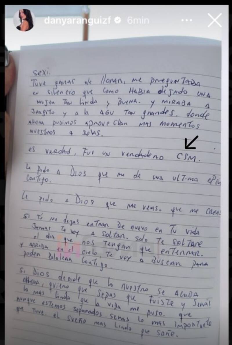 Ante una posible respuesta negativa, Valdivia en el escrito jura de guata que Aránguiz sería lo más lindo que le pasó en su vida: “Si Dios decide que lo nuestro se acaba ahora, quiero que sepas que fuiste y será lo más lindo que la vida me puso. Aunque estemos separados, serás lo más importante que tuve. El sueño más lindo que soñé”, cerró el ex seleccionado.