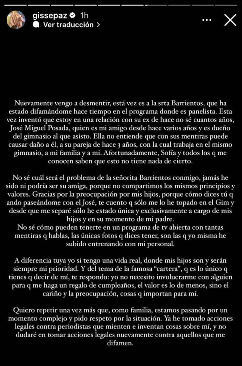 “No sé cuál será el problema de la señorita Barrientos conmigo, jamás he sido ni podría ser su amiga, porque no compartimos los mismos principios y valores”, dijo para finalizar en su historia.