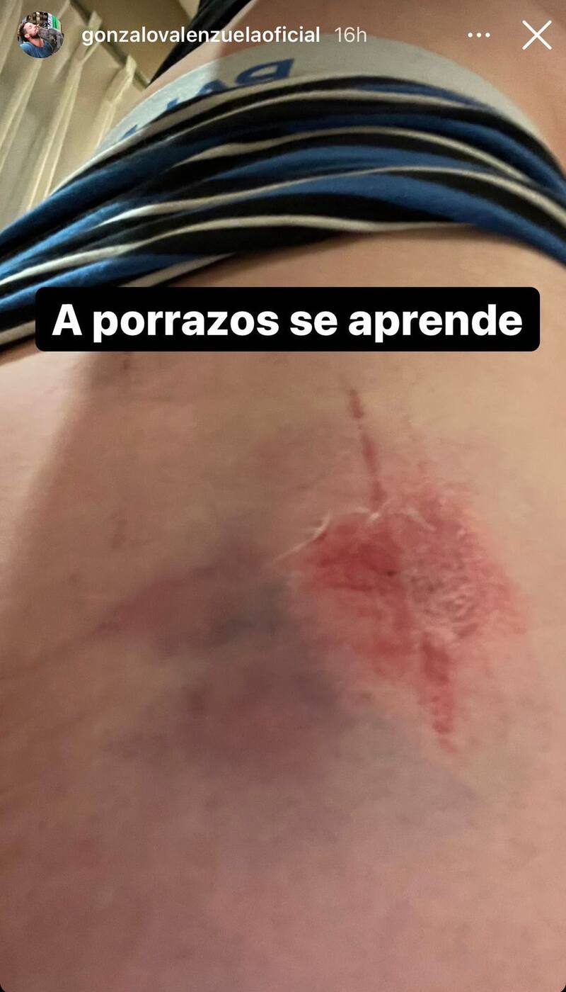 "A porrazos se aprende", escribió junto a una foto donde aparece cómo le quedó una de sus piernas.