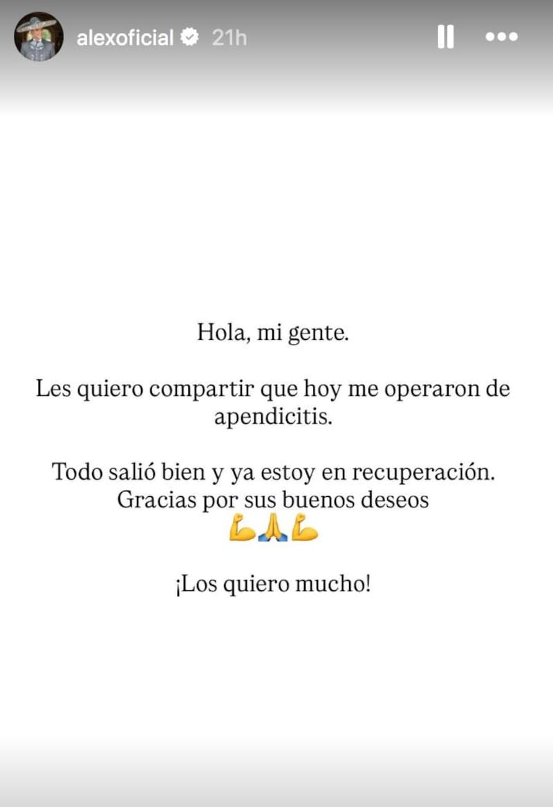 “Hola mi gente. Les quiero compartir que hoy me operaron de apendicitis”, escribió el cantante en sus historias de Instagram.
