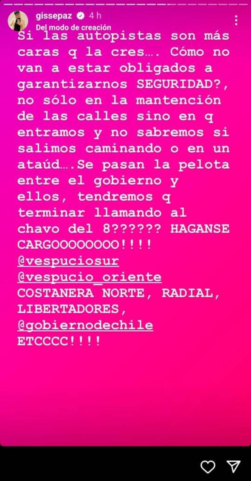 La influencer Gissella Gallardo utilizó sus redes sociales para mostrar su descontento sobre la delincuencia tras el duro caso de una encerrona en la Costanera Norte que se llevó a cabo el pasado domingo y que culminó con balazos y vehículos abandonados en el sector.