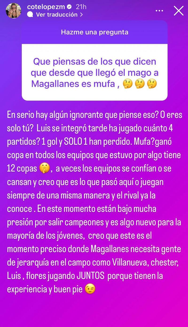 “¿En serio hay algún ignorante que piense eso? ¿O eres sólo tú? Luis se integró tarde y ha jugado cuatro partidos. 1 gol y solo han perdido uno ¿Mufa? Ganó copa en todos los equipos que estuvo, por algo tiene 12 copas”, le prestó ropa la influencer.