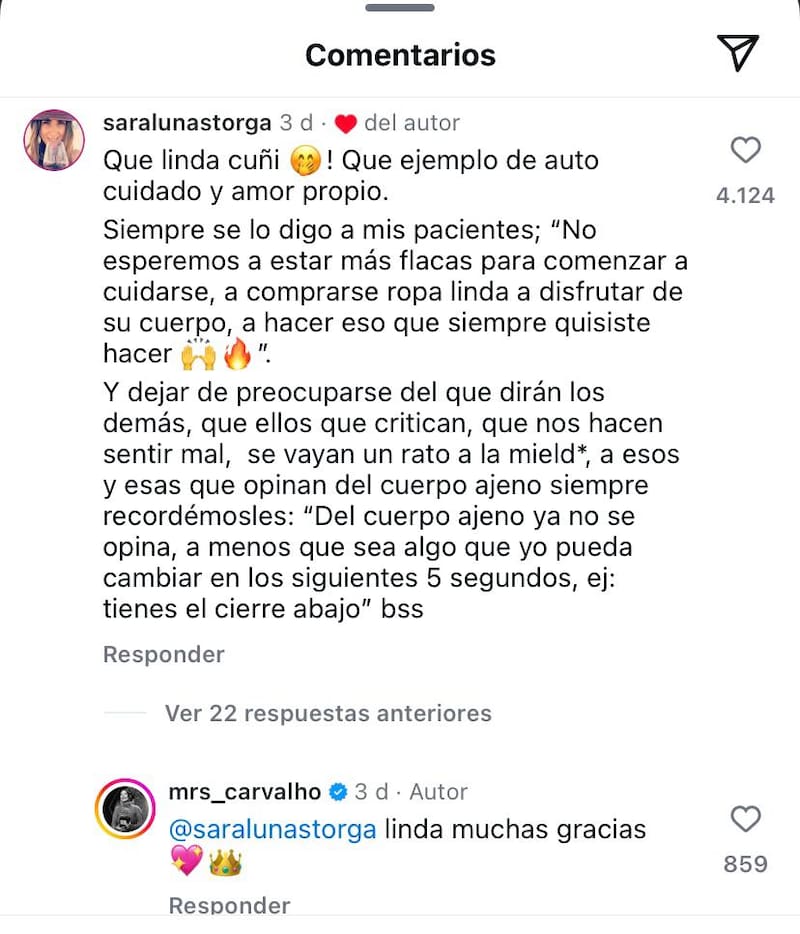 Por su parte, Sara Luna Astorga también se sumó a las palabras de su hermano: “¡Qué linda cuñi! Qué ejemplo de autocuidado y amor propio”.