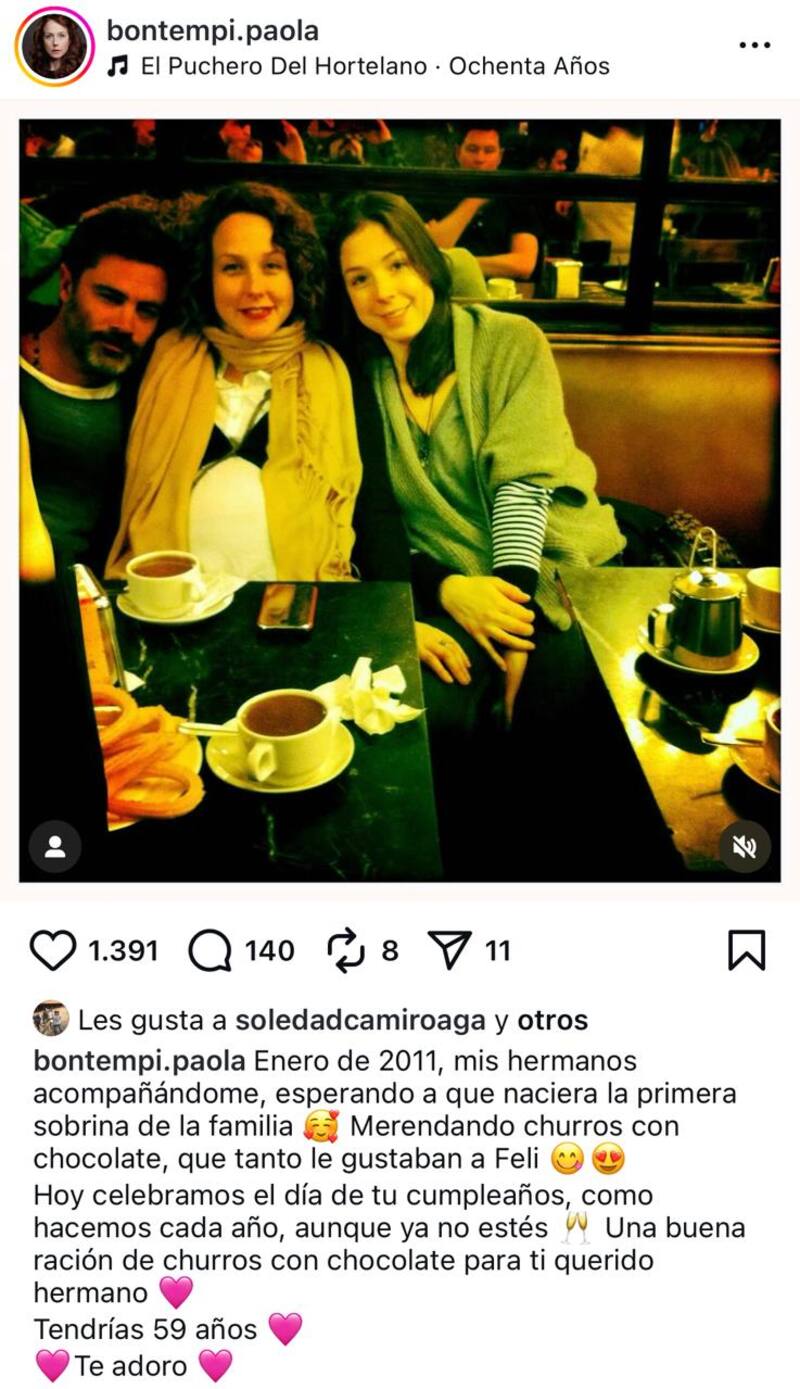 “Enero de 2011, mis hermanos acompañándome, esperando a que naciera la primera sobrina de la familia. Merendando churros con chocolate, que tanto le gustaban a Feli”, escribió Bontempi en su cuenta de Instagram.