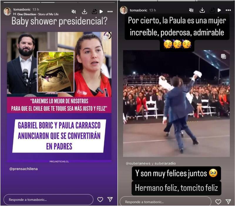 Como Tomás Boric, hermano menor del mandatario, quien compartió varias historias demostrando su felicidad por la noticia, como la imagen de la ecografía del bebé junto al texto: “Puntitooooo”.