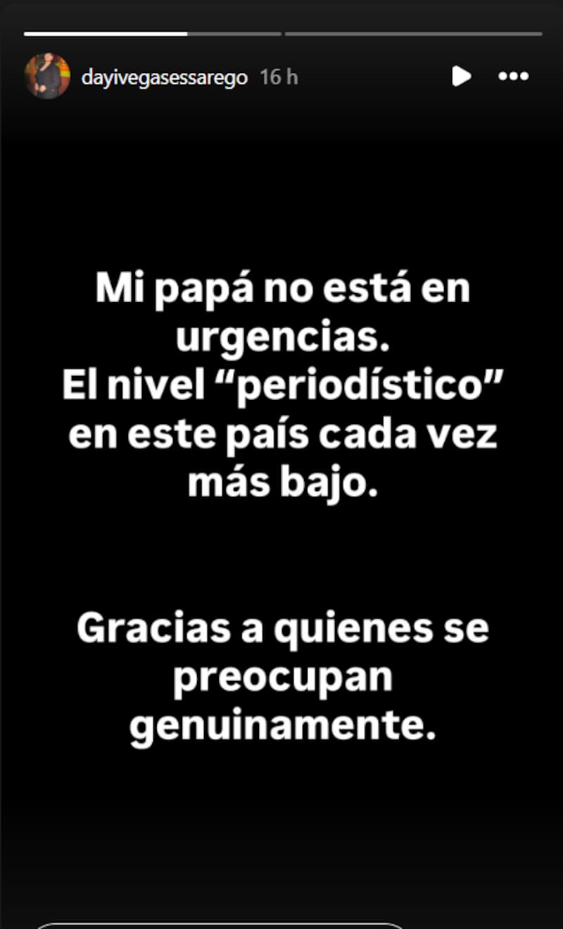 “Mi papá no está en urgencias. El nivel ‘periodístico’ en este país cada vez más bajo”, escribió Dayane en sus redes sociales, en medio de la polémica por el quiebre entre el músico y la comediante Yamila Reyna.