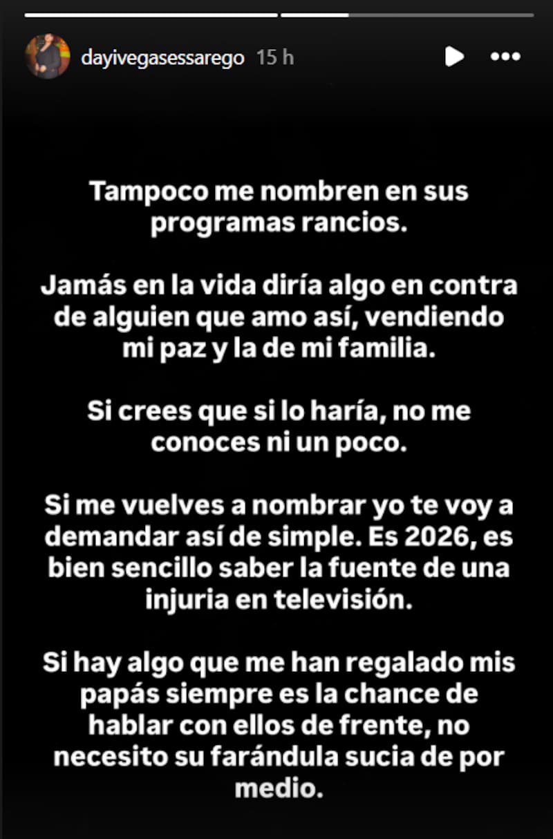 En otra publicación Dayane exigió no ser nombrada por los programas de farándula, amenazando incluso con acciones legales.