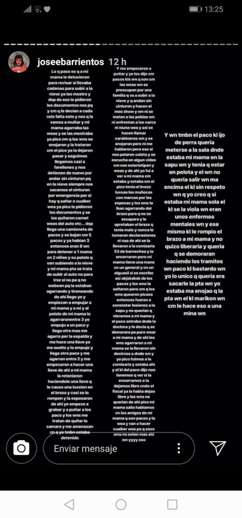 "Lo que pasó es que a mi mama la detuvieron para revisar si llevaba cadenas para subir a la nieve (...) Le decían a cada rato falta esto y la vamos a multar", comenzó relatando el joven en una historia que hizo viral la hermana de un amigo que lo acompañaba en el viaje.