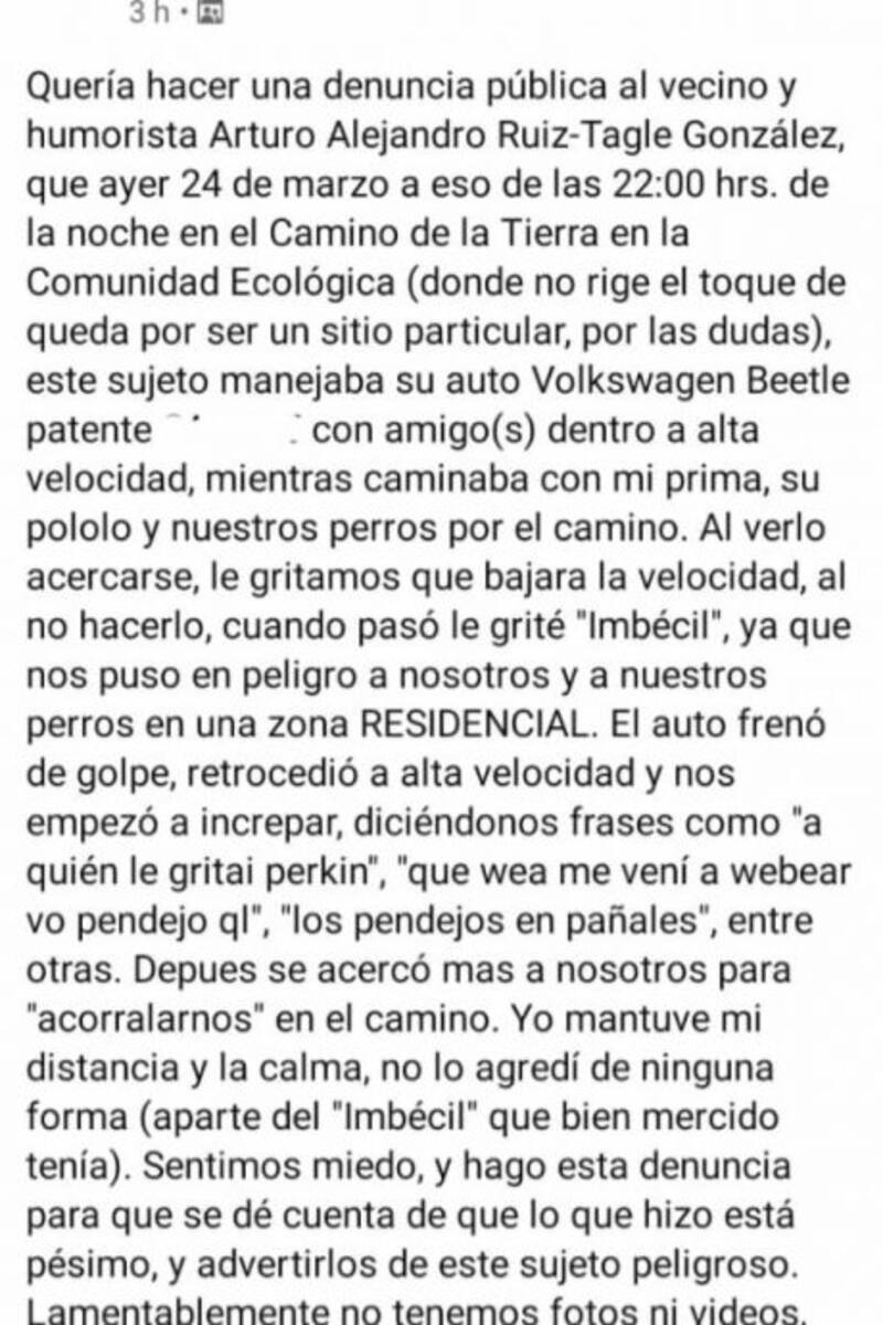 Durante las últimas horas, se comenzó a viralizar en redes sociales una particular "funa" en contra de Arturo Ruiz-Tagle. Esto, luego de que sus vecinos de la comunidad ecológica de Peñalolén lo acusan de conducir a exceso de velocidad por el lugar, y de encarar a unos jóvenes que lo increparon.