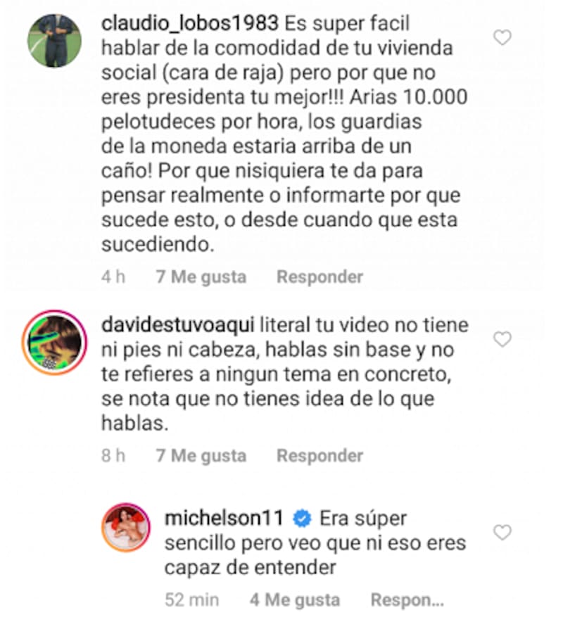 Pero eso no fue todo ya que tras ello siguió sus fuertes dichos contra quienes la criticaron. "Tu país está como está, dividiendo por clases sociales en vez de unirlo", fueron parte de la defensa de la influencer.
