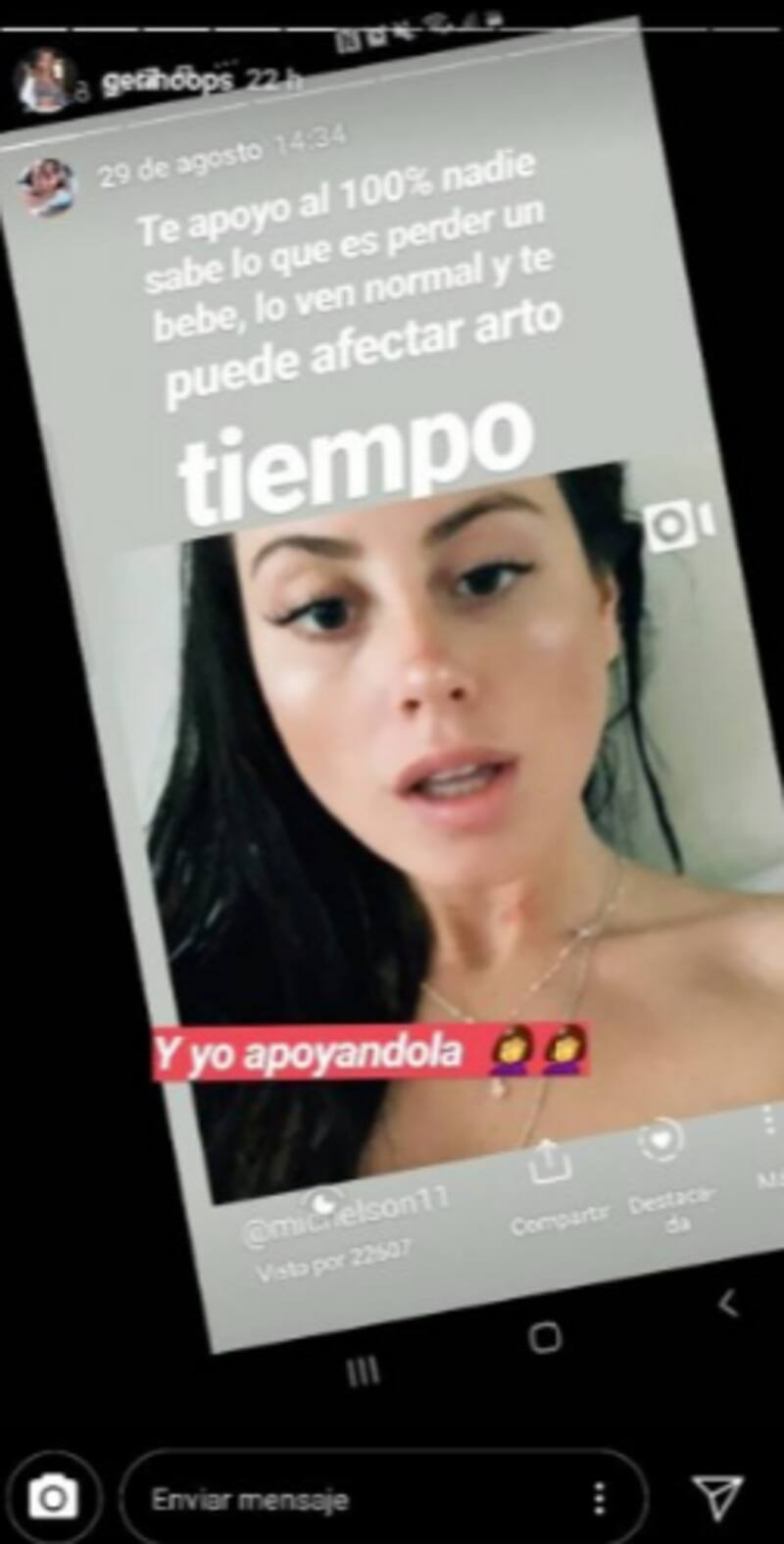 Tras aquel remezón la bailarina subió una story en su Instagram, donde mostró un mensaje que le envió a Michelson cuando la ex de Sargento Rap perdío a su bebé, el 29 de agosto con el título "Y yo apoyándola", con un elocuente emoticon.