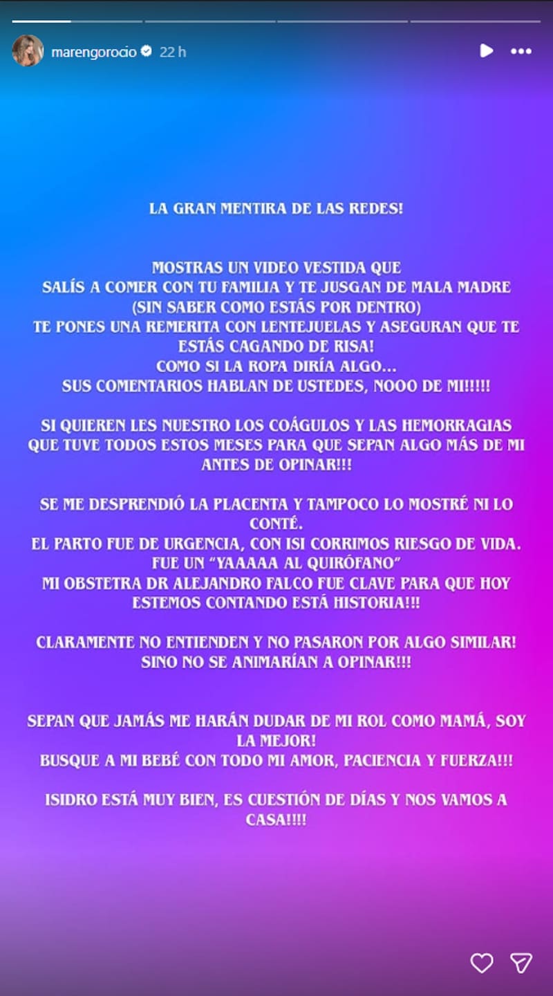“Sepan que jamás me harán dudar de mi rol como mamá, ¡soy la mejor! Busqué a mi bebé con todo mi amor, paciencia y fuerza. Isidro está muy bien, es cuestión de días y nos vamos a casa”, sentenció Rocío Marengo.