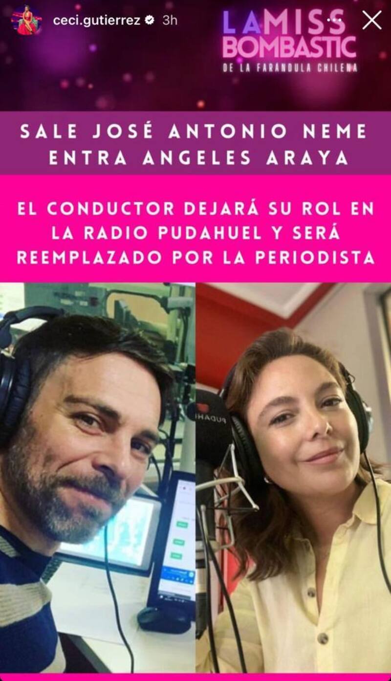 “Sale José Antonio Neme entra Ángeles Araya. El conductor dejará su rol en Radio Pudahuel y será reemplazado por la periodista”, comentó la comunicadora en una historia de Instagram.