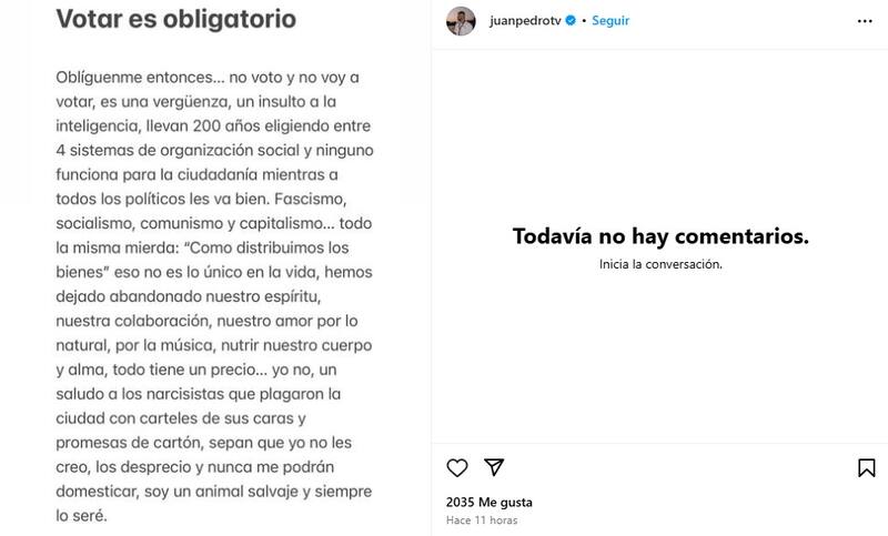 En marco de estas jornadas electorales, Juan Pedro Verdier compartió una reflexión en sus redes sociales donde criticó duramente a las elecciones y aseguró que no irá a votar.