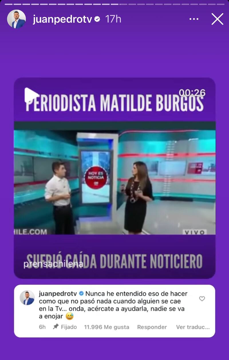 Juan Pedro Verdier comentó este suceso en su cuenta de Instagram y recalcó que, “nunca he entendido eso de hacer como que no pasó nada cuando alguien se cae en la TV… Onda acércate a ayudarla, nadie se va a enojar”.