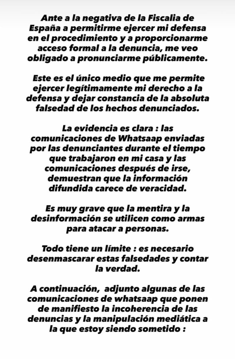 Luego, indicó que Instagram es el “único medio que me permite ejercer legítimamente mi derecho a la defensa y dejar constancia de la absoluta falsedad de los hechos denunciados”.