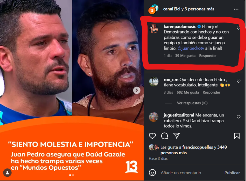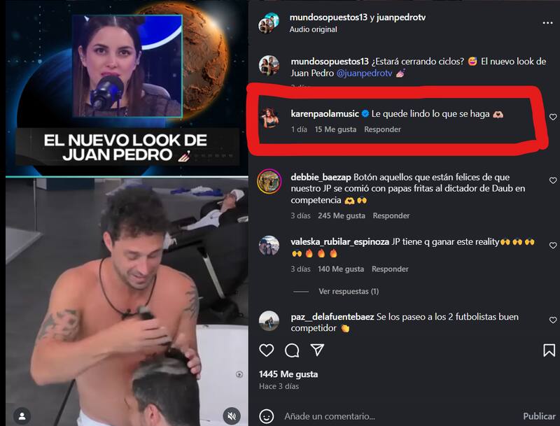 Fue en dicho post, donde Karen comentó: “El mejor! Demostrando con hechos y no con palabras como se debe guiar un equipo y también como se juega limpio. @juanpedrotv a la final!“.