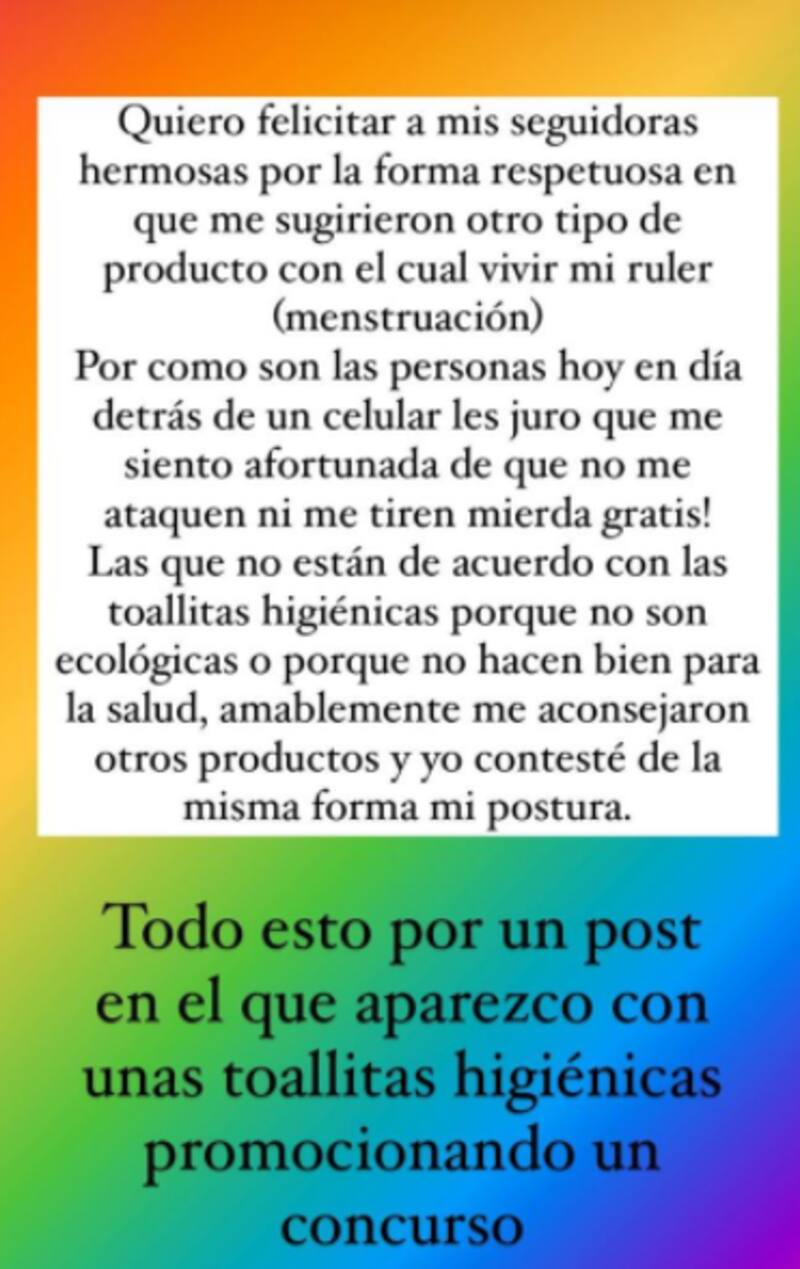 "Quiero felicitar a mis seguidoras hermosas por la forma respetuosa en que me sugirieron otro tipo de producto con el cual vivir mi ruler (menstruación). Por como son las personas hoy en día detrás de un celular les juro que me siento afortunada de que no me ataquen ni me tiren mierda gratis. Las que no están de acuerdo con las toallitas higiénicas porque no son ecológicas o porque no hacen bien para la salud, amablemente me aconsejaron otros productos y yo contesté de la misma forma mi postura", comenzó Karla.