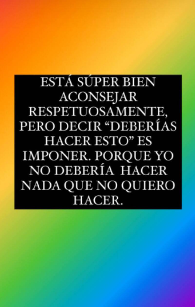 "Está súper bien aconsejar respetuosamente, pero decir 'deberías hacer esto' es imponer. Porque yo no debería hacer nada que no quiero hacer", finalizó.