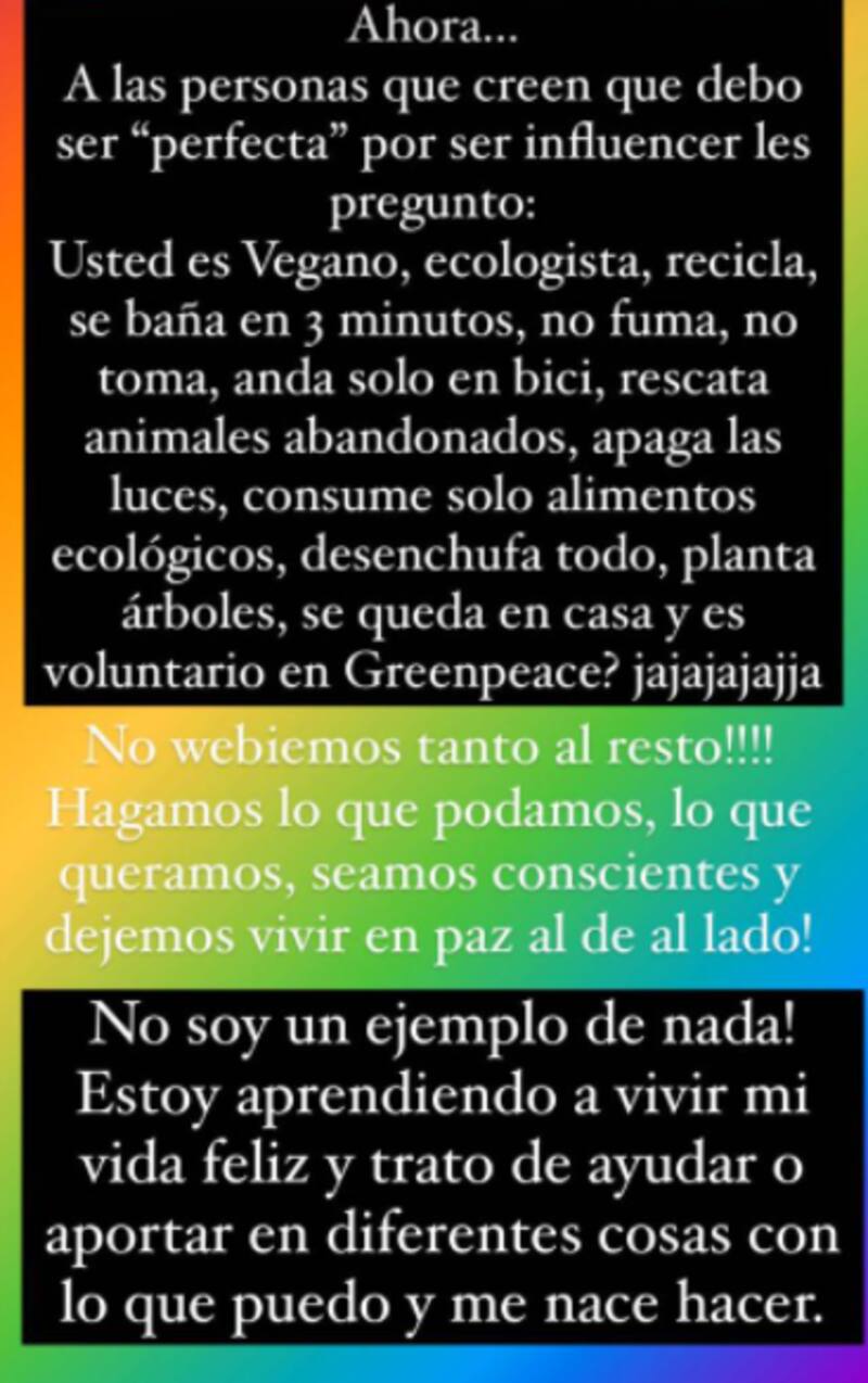 Tras eso continuó diciendo que "Ahora… a las personas que creen que debo ser 'perfecta' por ser influencer les pregunto: Usted es vegano, ecologista, recicla, se baña en 3 minutos, no fuma, no toma, anda solo en bici, rescata animales abandonados, apaga las luces, consume solo alimentos ecológicos, desenchufa todo, planta árboles, se queda en casa y es voluntario en Greenpeace? jajajajajja. No webiemos tanto al resto. Hagamos lo que podamos, lo que queramos, seamos conscientes y dejemos vivir en paz al de al lado. No soy un ejemplo de nada. Estoy aprendiendo a vivir mi vida feliz y trato de ayudar o aportar en diferentes cosas con lo que puedo y me nace hacer.