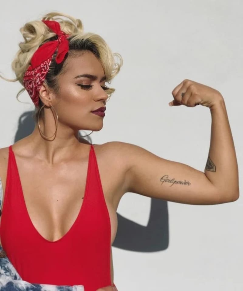 En 2017, Karol G se tatuó en su brazo izquierdo “Girl Power” (Poder femenino, lema que inspiró la primera noche de Viña 2023), que le recuerda toda la fuerza y poder que tiene ella.