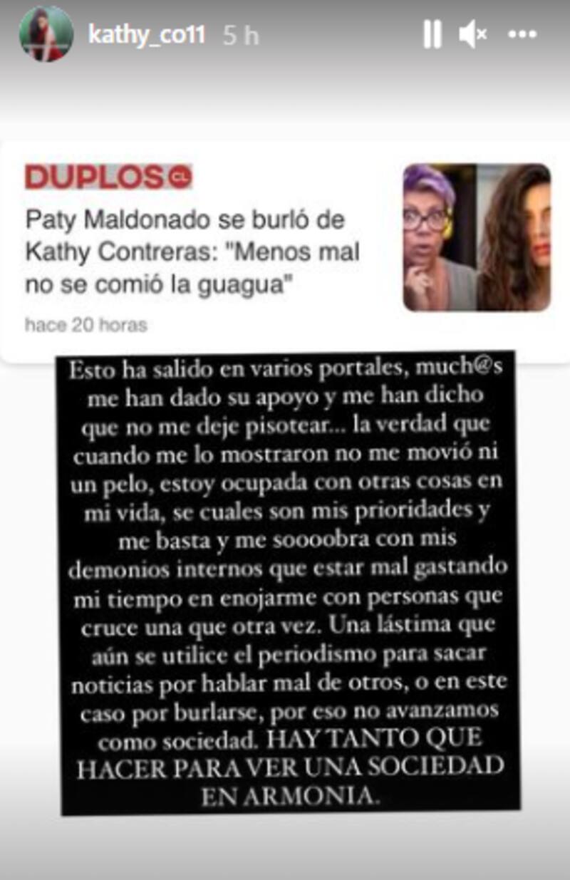 En ese contexto, y tras la viralización de la crítica de Maldonado, Kathy Contreras ocupó sus redes sociales para responderle a la opinóloga.