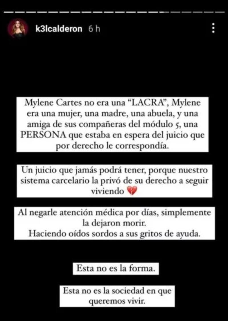Finalmente, subrayó que “Mylene Cartes no era una ‘lacra’, Mylene era una mujer, una madre, una abuela y una amiga de sus compañeras del módulo 5, una PERSONA que estaba en espera del juicio que por derecho le correspondía. Un juicio que jamás podrá tener, porque nuestro sistema carcelario la privó de su derecho a seguir viviendo”, sostuvo.