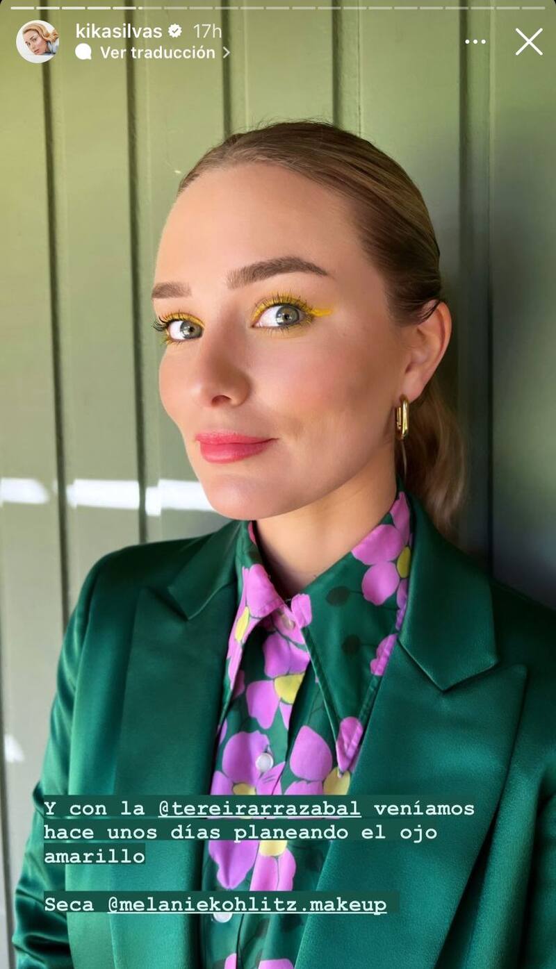 Además, Kika presumió el look que ella misma lució en el evento, con un traje verde esmeralda y una blusa floreada, además de sus ojos maquillados en color amarillo.