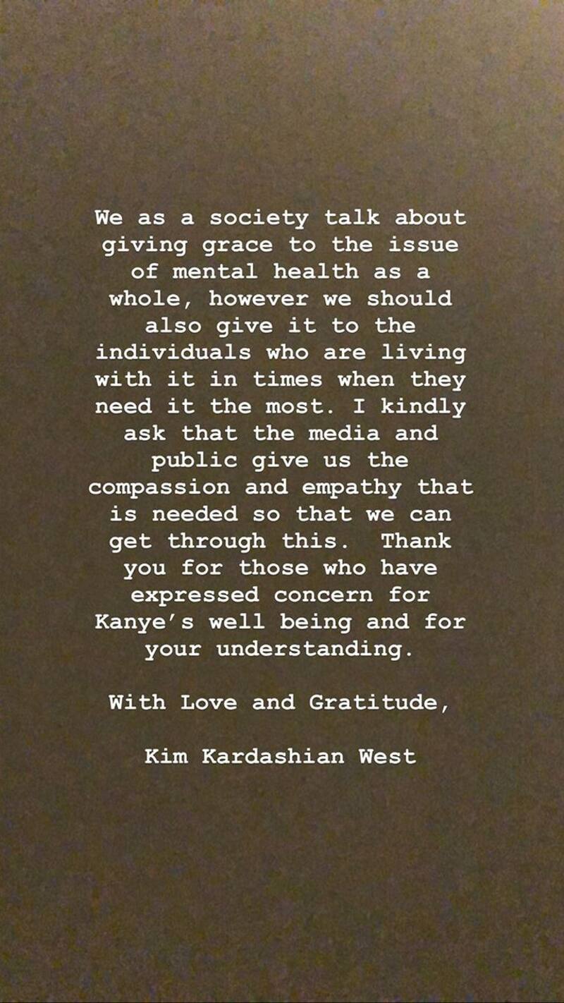 "Nosotros, como sociedad, hablamos de dar gracia al tema de la salud mental en su conjunto, sin embargo, también deberíamos dárselo a las personas que viven con él en los momentos en que más lo necesitan. Gracias a aquellos que han expresado su preocupación por el bienestar de Kanye y por su comprensión. Con amor y gratitud, Kim Kardashian West", finalizó.