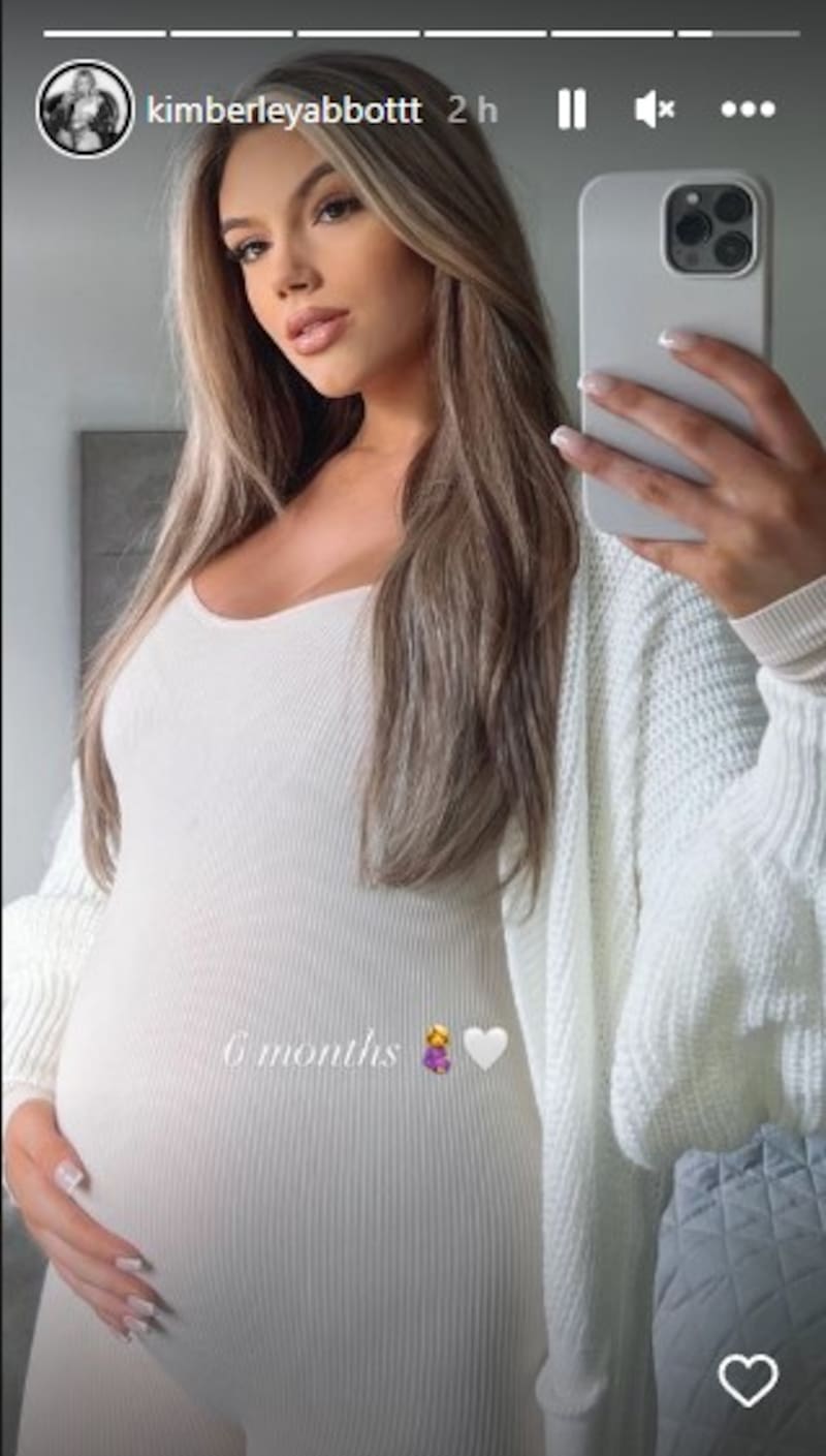 A través de sus historias de Instagram, Kimberley Abbott posteó otros registros celebrando con sus seguidores sus seis meses de embarazo. “6 months”, añadió posando frente al espejo mostrando los cambios de su figura.