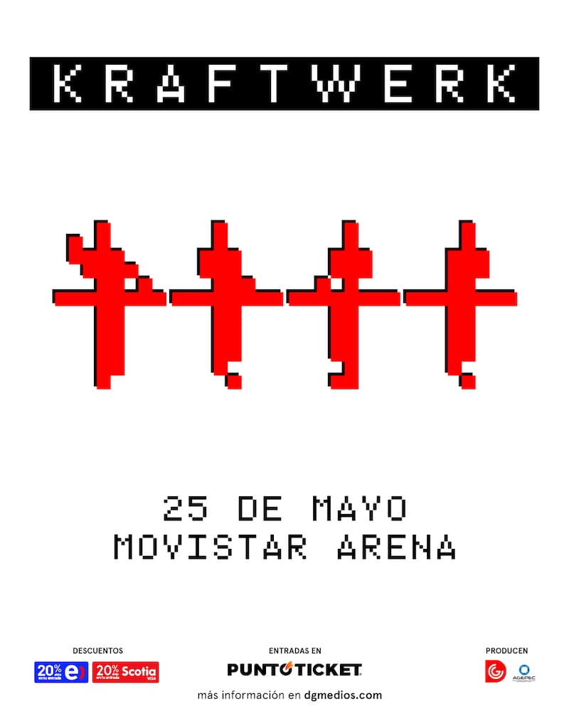 La preventa para el show de Kraftwerk en el Movistar Arena el 25 de mayo de 2023 comenzará este miércoles 15 de febrero a las 11 am y tendrá un descuento exclusivo de 20% para clientes Entel o pagando con Tarjetas Scotia. Los precios con descuento van desde $25.650 hasta $72.200 (recargo incluido).