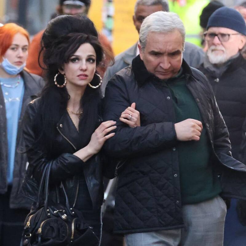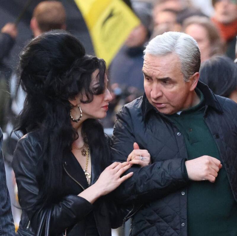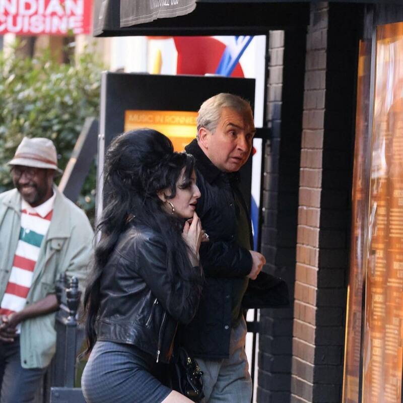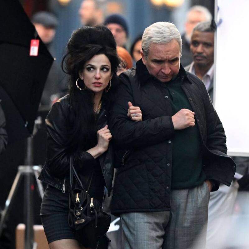 También, se le puede ver tomada del brazo del actor Eddie Marsan, que interpreta a su padre Mitch Winehouse, quien fue muy importante en la vida de Amy.