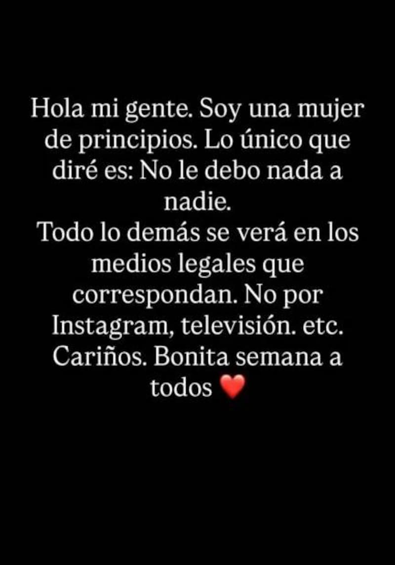 “Soy una mujer de principios. Lo único que diré es: No le debo nada a nadie”, escribió en una storie que compartió en Instagram.