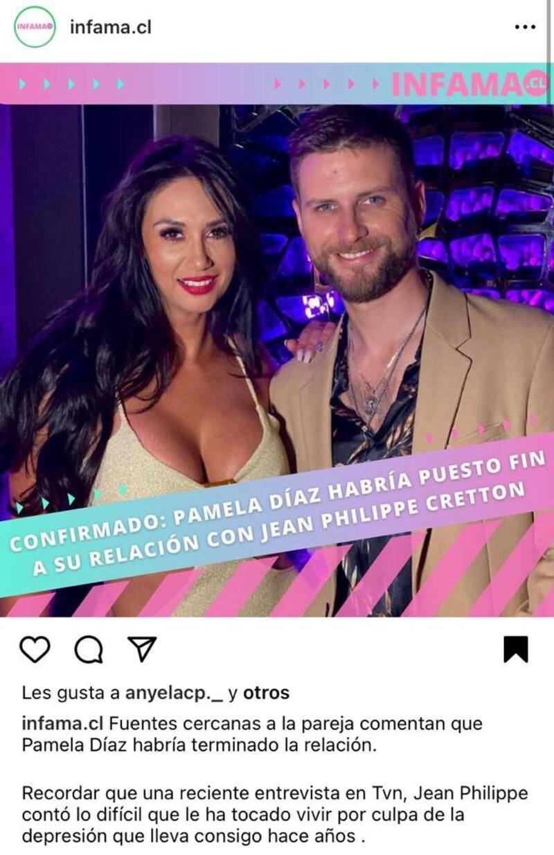 “Fuentes cercanas a la pareja comentan que Pamela Díaz habría terminado la relación. Recordar que una reciente entrevista en TVN, Jean Philippe contó lo difícil que le ha tocado vivir por culpa de la depresión que lleva consigo hace años”, dijo el medio.