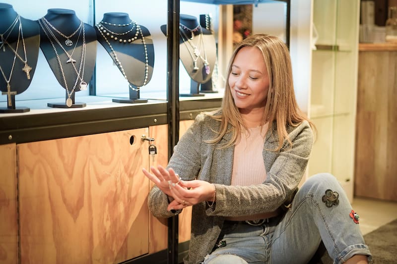 Le he hecho anillos a gente famosilla. A la Antonella Ríos, o sea al chico que le pidió matrimonio en esa época, le hice el anillo, que era un zafiro con unos diamantes, precioso; no se casaron, jajaja. Le hice también una colleras con forma de herradura al Kike Morandé, que le gustan mucho los caballos. He hecho varias pegas a actores, anillos de actor a actriz, de actor con actor... No todos se pueden contar; sólo soy la herramienta para conseguir un producto. Vendo por Instagram y acá en mi tienda en Mall Vivo Panorámico, Providencia, Zona Tendencias, piso -1; llevo ya seis meses aquí. Pero llevo hartos años vendiendo mi trabajo... y ordenado, ¡ah!, con Servicio de Impuestos Internos (SII), contador y toda la cuestión, jajaja.